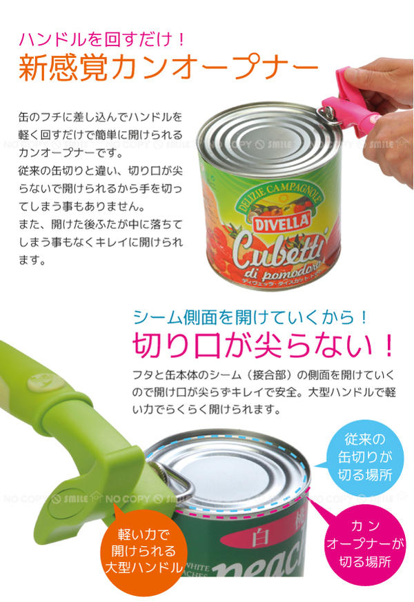 従来の缶切りとは違い、フタと缶本体のシーム(接合部)の側面を開けていくので、開け口も尖ることなくキレイで安全。